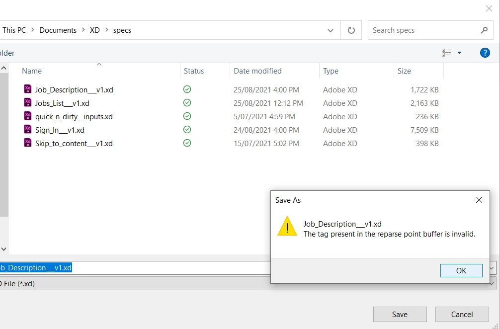 - I try to overwrite the local file with "Save as" using the same name (Job_Description_v1.xd), and a dialogue pops up with "The tag present in the reparse point buffer is invalid." and XD won't allow me to overwrite my file that way.