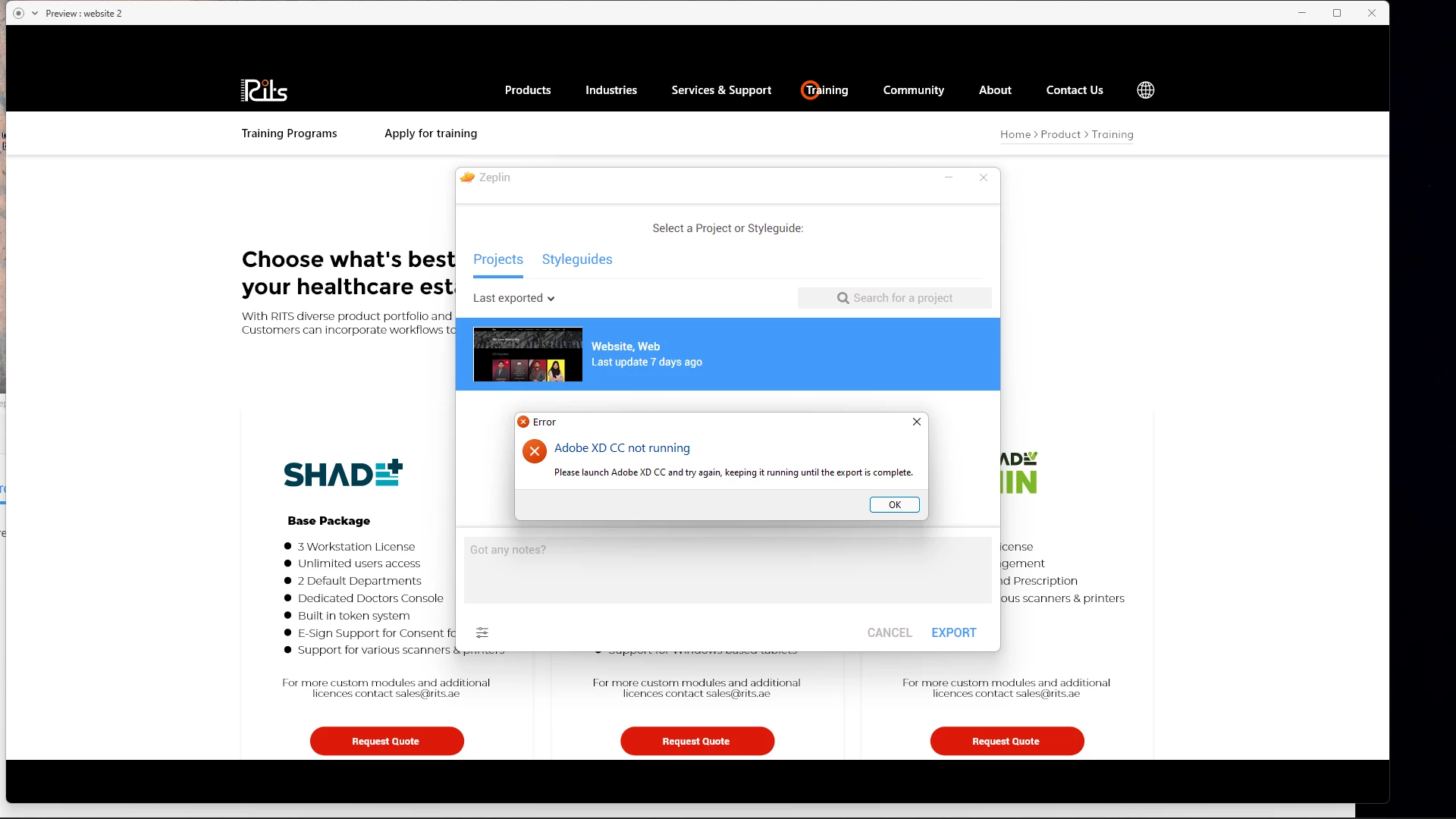 When I try to export (using File > Export), it says that Adobe XD CC is not running (but it is), and I have to launch it again.