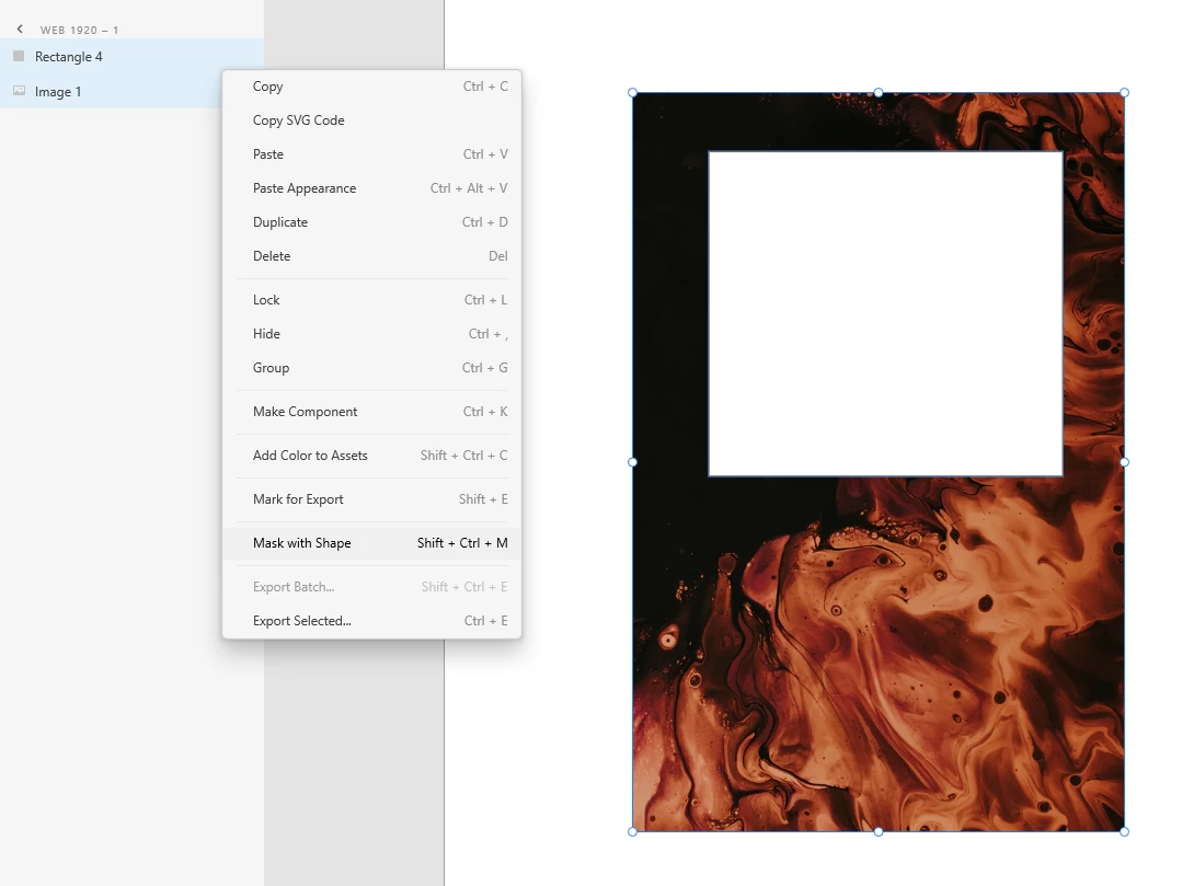 2. Select both image and the rectangle in the layers panel, right click, and select "Mask with Shape.