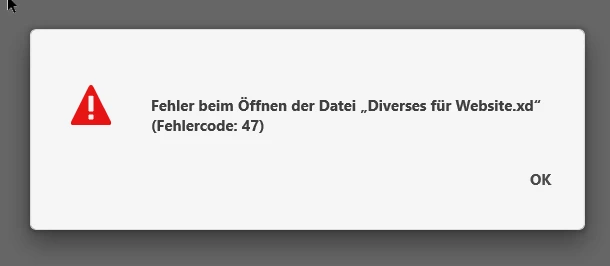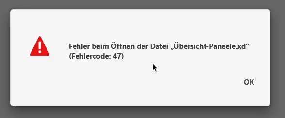 "Fehler beim Öffnen der Datei „Dateiname xyz.xd“ (Fehlercode: 47)" aus.