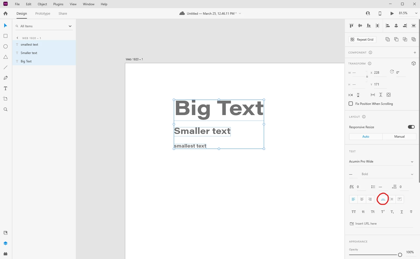 How can I change text size not position (please see video inside)
