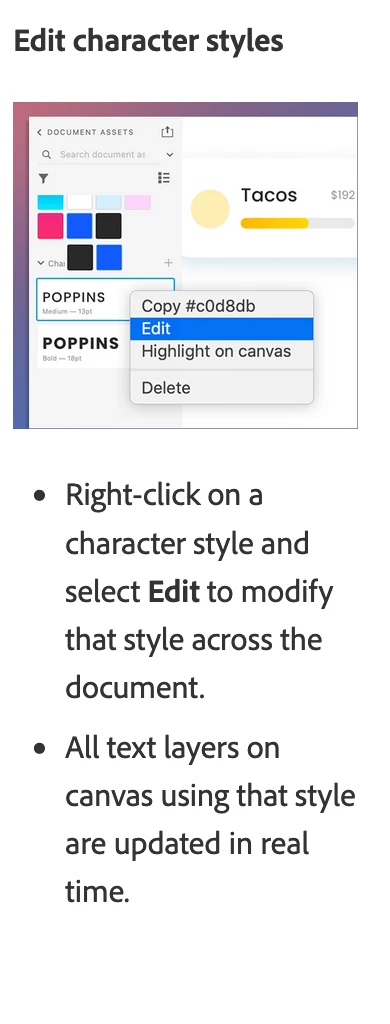 How do I edit a character style? The user guide instructs you to right-click it in the Document Assets panel then click Edit in the dropdown, but I don't see "Edit" as an option. And is there any alternate way to update a style or is this the only route (such as by modifying an instance of it and pushing updates to the style)?