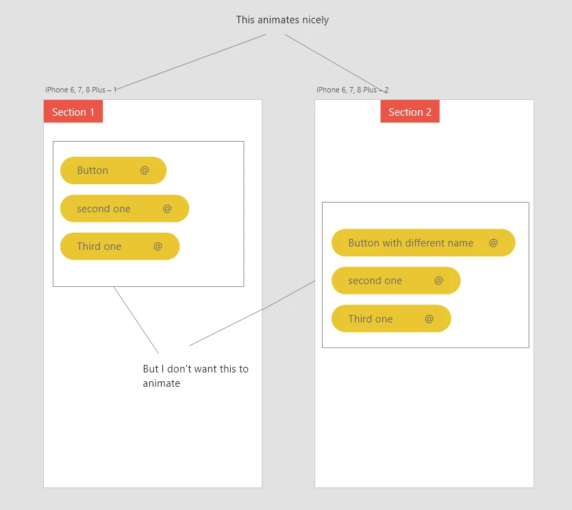 Hi XD users. I want to auto-animate header section so the tab is sliding left to right (which is working fine) the problem is that buttons created from single component auto-animates as well and I have no idea how to turn it off. I changed their names in outliner but it didn't work. Do you have any workarounds for this?