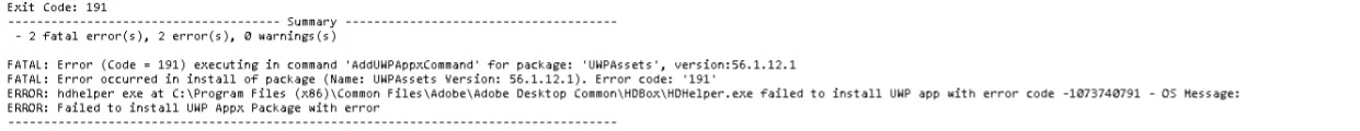 Exit Code: 191 -------------------------------------- Summary -------------------------------------- - 2 fatal error(s), 2 error(s), 0 warnings(s) FATAL: Error (Code = 191) executing in command 'AddUWPAppxCommand' for package: 'UWPAssets', version:56.1.12.1 FATAL: Error occurred in install of package (Name: UWPAssets Version: 56.1.12.1). Error code: '191' ERROR: hdhelper exe at C:\Program Files (x86)\Common Files\Adobe\Adobe Desktop Common\HDBox\HDHelper.exe failed to install UWP app with error code -1073740791 - OS Message: ERROR: Failed to install UWP Appx Package with error -------------------------------------------------------------------------------------