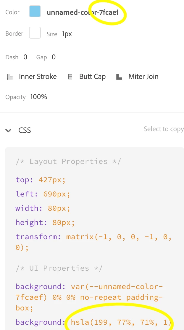 Eg: #7FCAEF shows a HSLA value of: hsla(199, 77%, 71%, 1):
