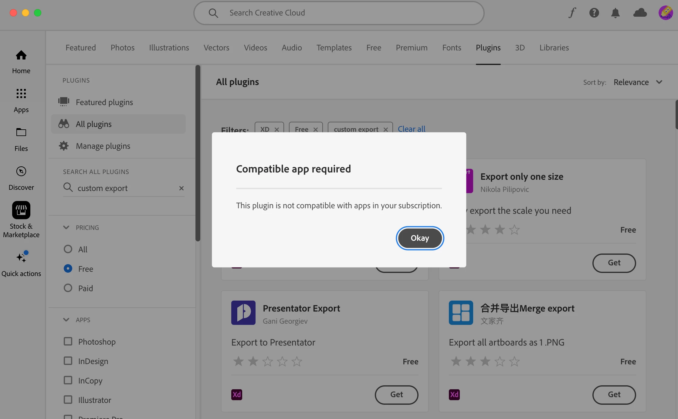 i face this issue this plugin is not compatible with apps in your subscription adobe xd