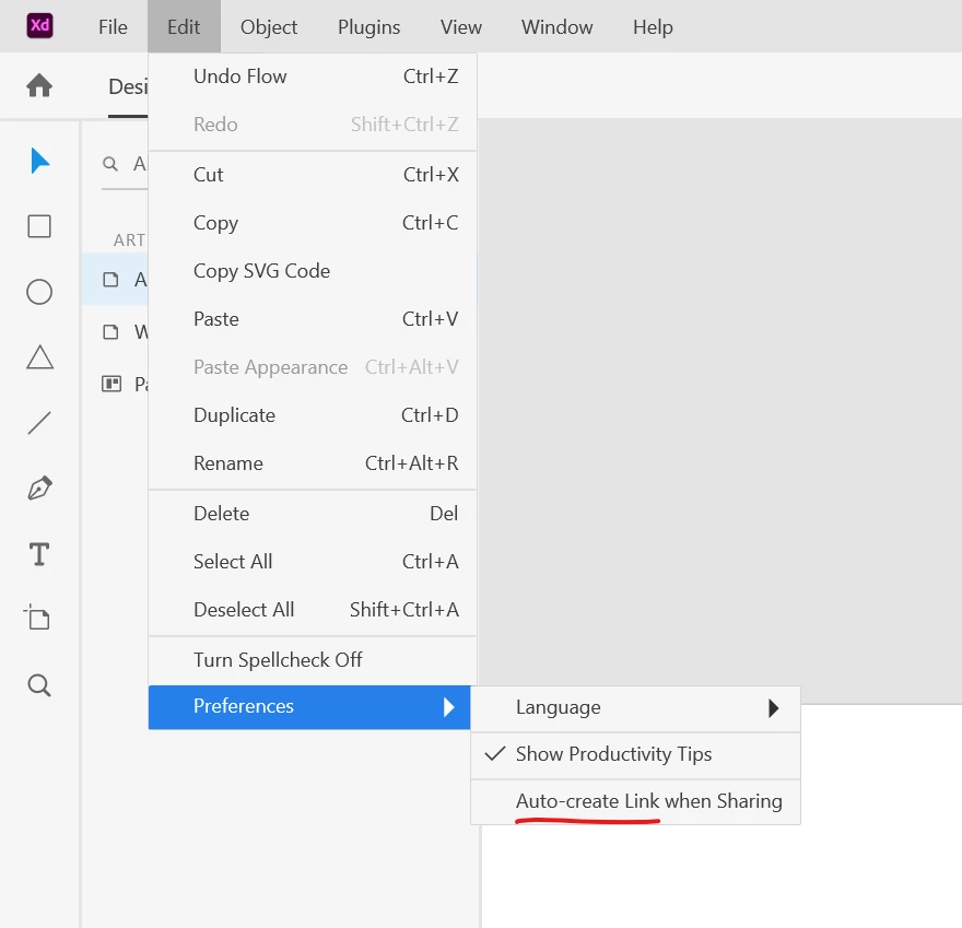 -> click on the XD icon -> Settings -> Auto-create link when sharing (uncheck it)