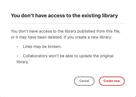 I thought I'd try the community as I've having issues with publishing my docuemnt assets as a new library. I've built out a design system, and have all the templates/assets saved in the document assets panel as components. These are all elements that I've built myself and aren't being linked from another document. When I hit 'Publish', I'm served with the attached message "You don't have access to the existing library - You don't have access to the library published from this file, or it may have been deletd"