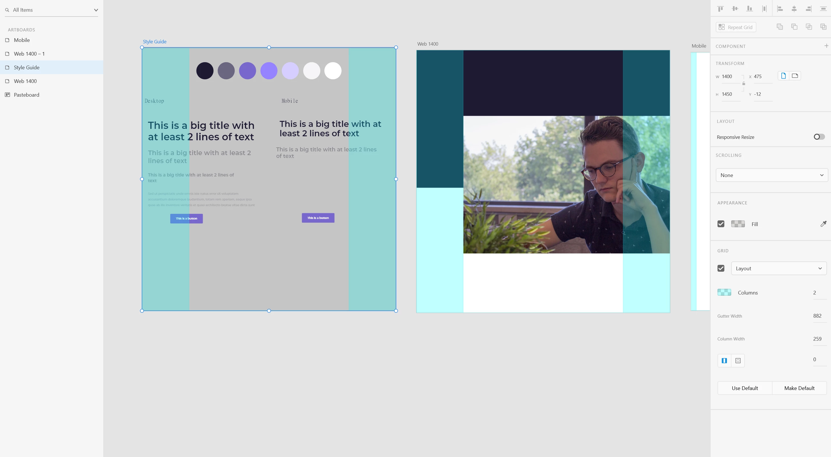 - Have a style guide artboard that does not have a layout grid visible