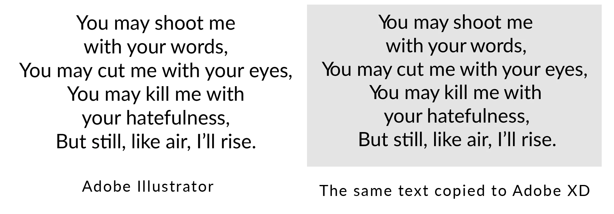 Whenever I copy and paste text from Illustrator to XD, the letter spacing between certain pairs of characters appears to default to zero. This is currently the case for both Lato and Noto Sans.