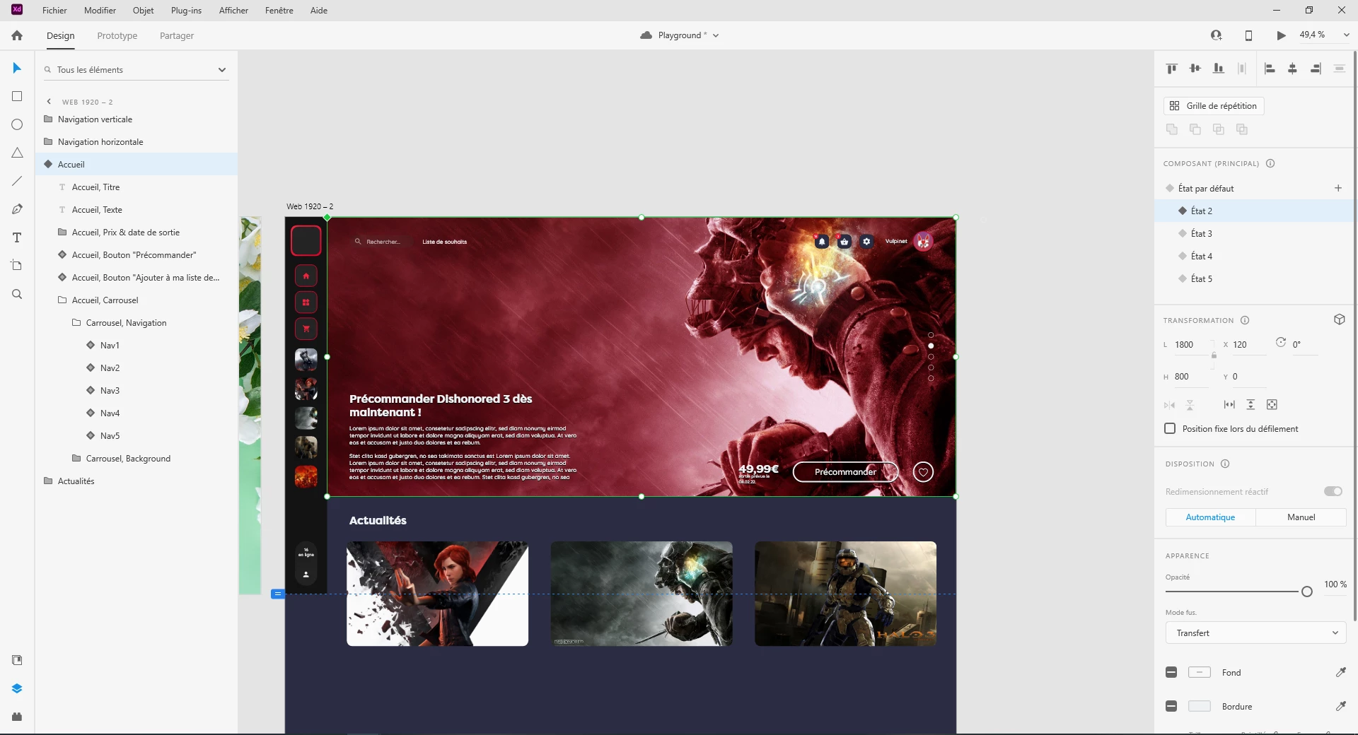 Ci-dessus : Second état du composant Accueil, montrant la seconde tuile du carrousel. Le composant Navigation change lui aussi d'état pour montrer le changement de tuile.