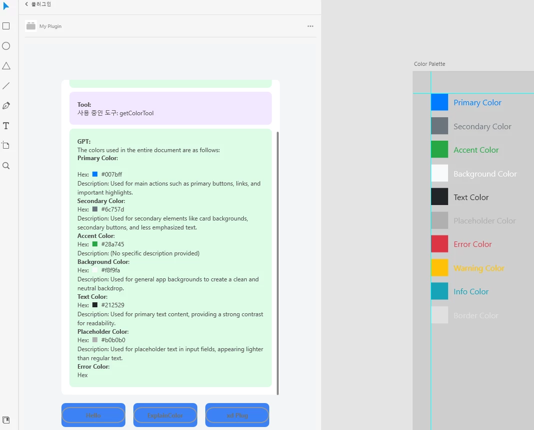 - We use LangChain.js and directly run it within XD without external web hosting, enabling real-time interaction with layouts (e.g., finding components in the layout, copying them to a new artboard, adjusting styles based on preset color assets).