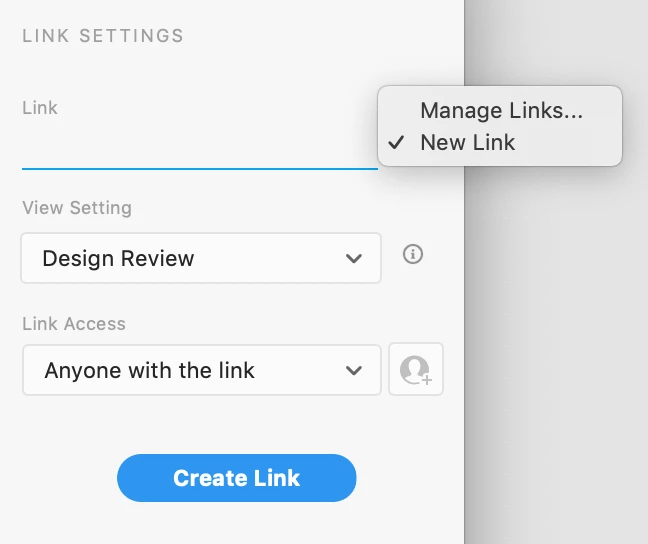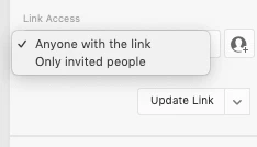 Note that if you are looking to set password on an existing link that is 'Public' or is showing the link access set as 'Anyone with the link', then you will have to create a new password link. The existing 'Public' link cannot be changed to a Password-Protected link. To create a new link, click on the "Link" drop-down and choose New Link (as shown in this screenshot)