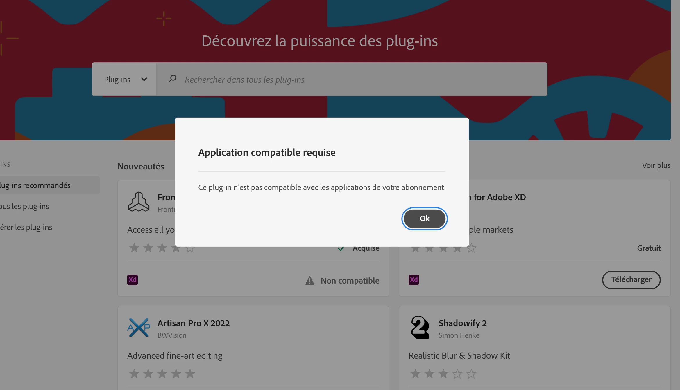 Le message est le suivant : "Application compatible requise / Ce plug in n'est pas compatible avec les applications de votre abonnement."