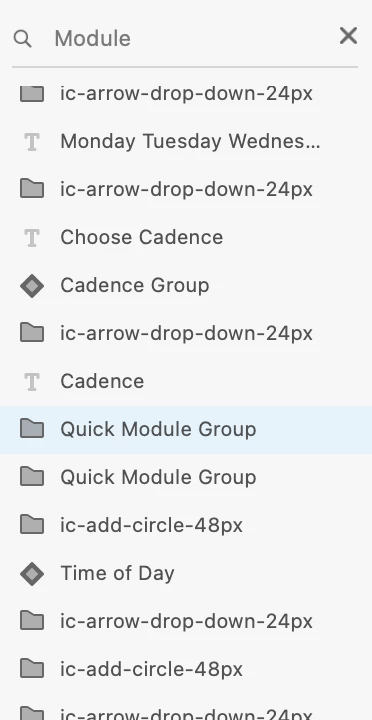 Below I have the search term "Module" in the search bar (using the "All Items" search setting) and XD isn't showing me any search results at all (there are two in this screenshot example but hundreds across the document for this search term). It's like nothing is happening when I input text – No response from the app