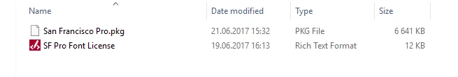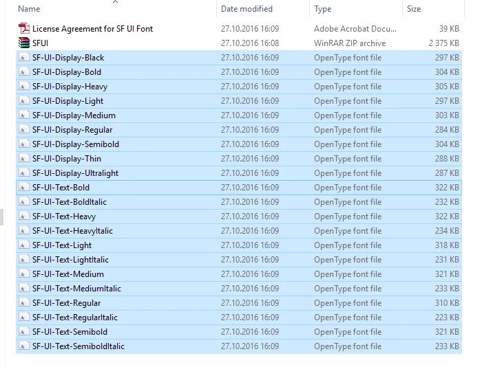 Is there an official SF typeface release for Windows users somewhere? In the License agreement for SF UI font is says For IOS and OSX application only but I'm able to write with all the weights in Windows and as you can see they are in OT formats.
