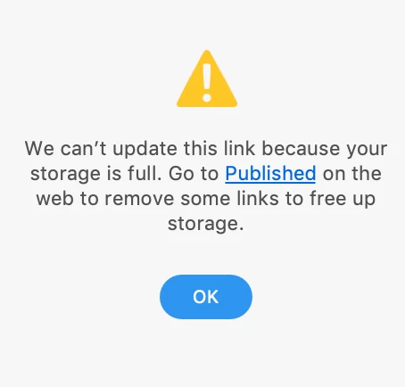 I am not able to update by XD file's published links. Getting an error about my storage being full, but as you can see in the attached image - I still have more than plenty free space in my cloud storage.
