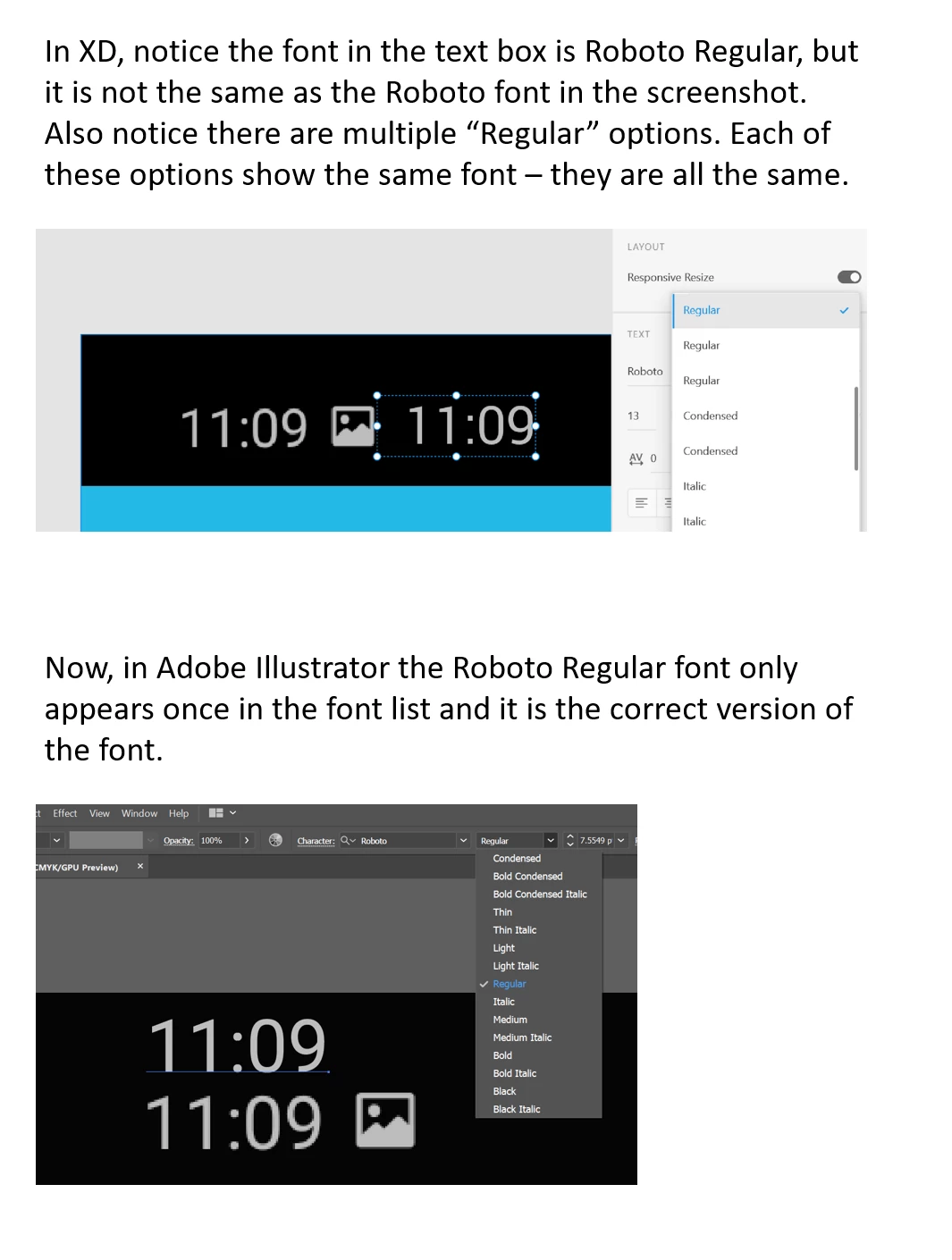 I posted about a similar issue yesterday, but now I can't find that post. My Roboto font works fine in Illustrator but in XD it is using the wrong font family and won't let me switch it out.