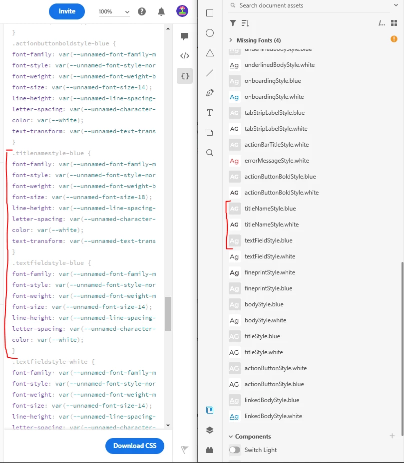 When I try to download the CSS file from the XD Share link, there are 1 or 2 styles that are missing from the file, but are definitely added to the original XD file.