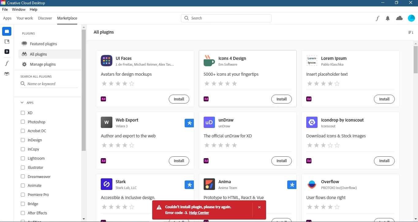 The other thing I face, I have a problem with installing the plugin from the marketplace, some of the plugins seem like it installed but I can't see it in XD when I need to use it, also when I try to install it shows me an Error code.