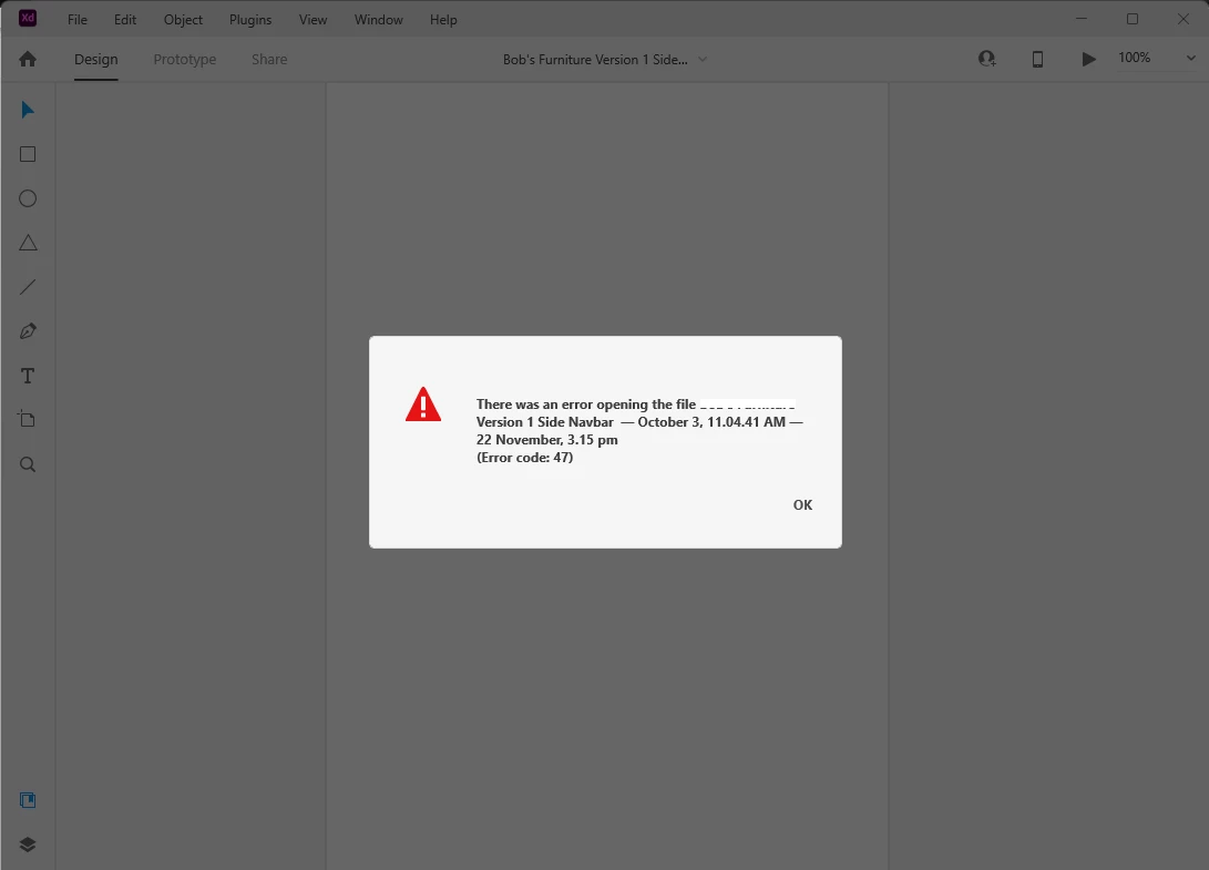 Thank you for reaching out. Would you mind trying the steps suggested in this post: https://community.adobe.com/t5/adobe-xd-discussions/error-quot-sorry-we-can-t-open-this-document-in-adobe-xd-quot-or-error-47-while-opening-the-cloud/td-p/10415491 and let us know if that helps?