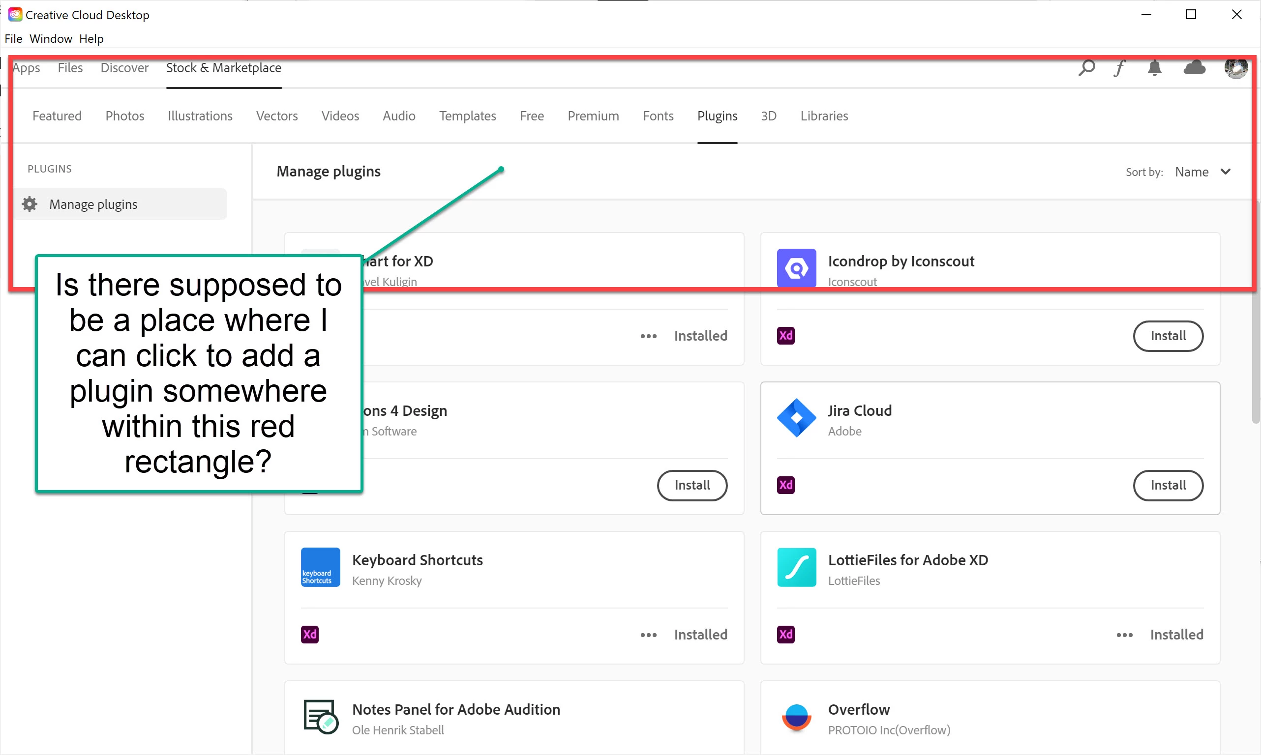 There is no blue plus button above my plugins within the XD environment or ability within the plugins screen (which I get to by going to "plugins" on the XD menubar) to search for plugins.
