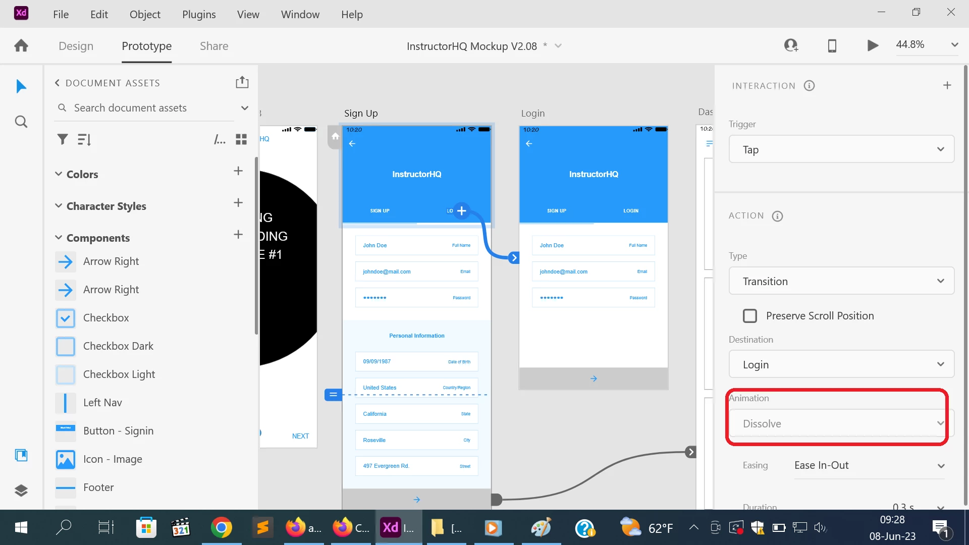 I found the answer here: https://community.adobe.com/t5/adobe-xd-discussions/unable-to-change-transition-from-dissolve/m-p/8974017#M2090 He said the blue line appears at "the fold" when the artboard is clicked. But I dont know what he means in my case? When I click Login Artboard, there is no blue line.