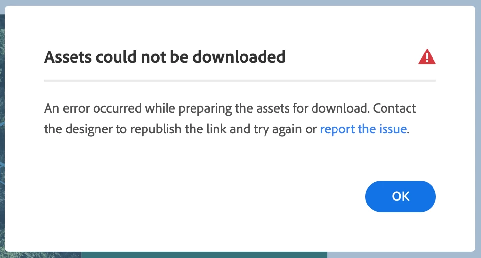 I tried exporting my assets from my XD file by selecting all the assets and clicking on the "Download" button but it gave an error saying the program couldn't be downloaded.