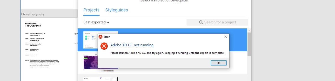 Unable to export XD files created with XD 49 version to Zeplin, error "Adobe XD CC not running"