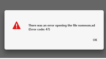 Hi, i have a problem on my local XD file, was working offline since the internet is not that good, i was working on a XD design when my computer crashed. when i tried opening the file again i got an "error opening file (error code: 47)"