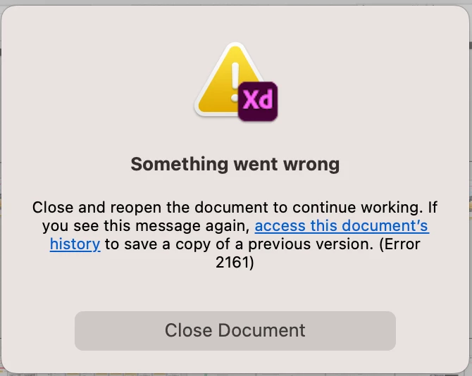 Close and reopen the document to continue working. If you see this message again, access this document’s history to save a copy of a previous version. (Error 2161)