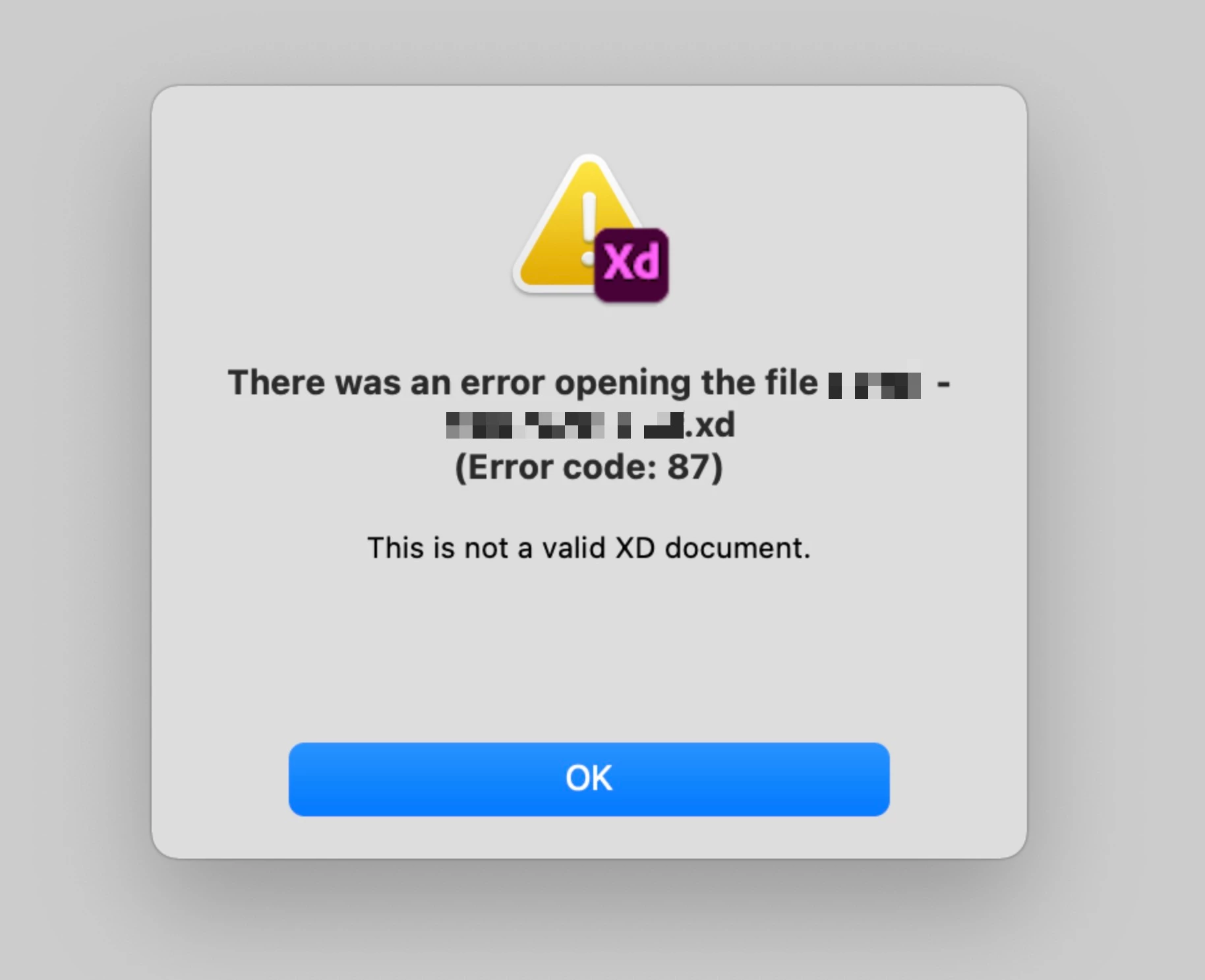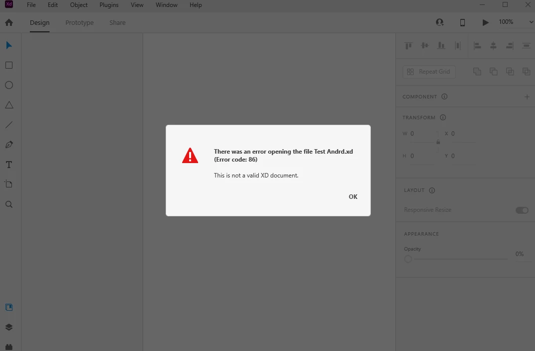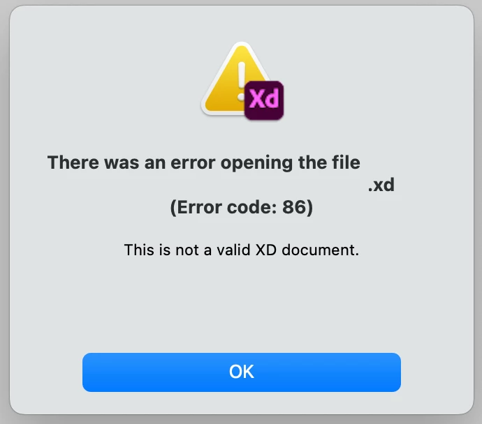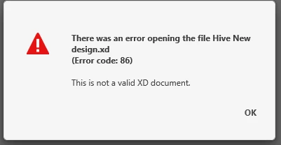 If you have error code 86 when opening an Adobe XD file.