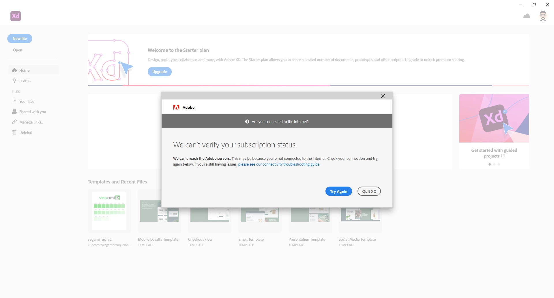 When i open adobe XD, the message below appeart.