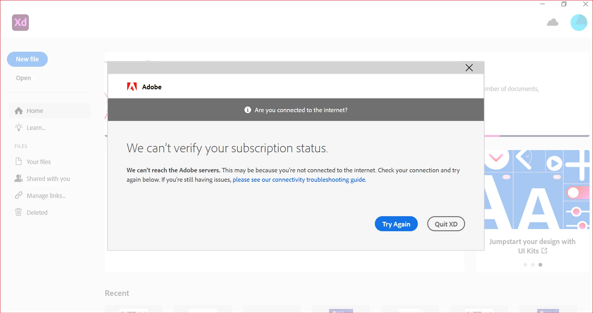 For the last 2 days, I try to open XD, but it is throwing out an error to me, despite that I have a license for Adobe Enterprise. The screenshot is attached here for your reference.