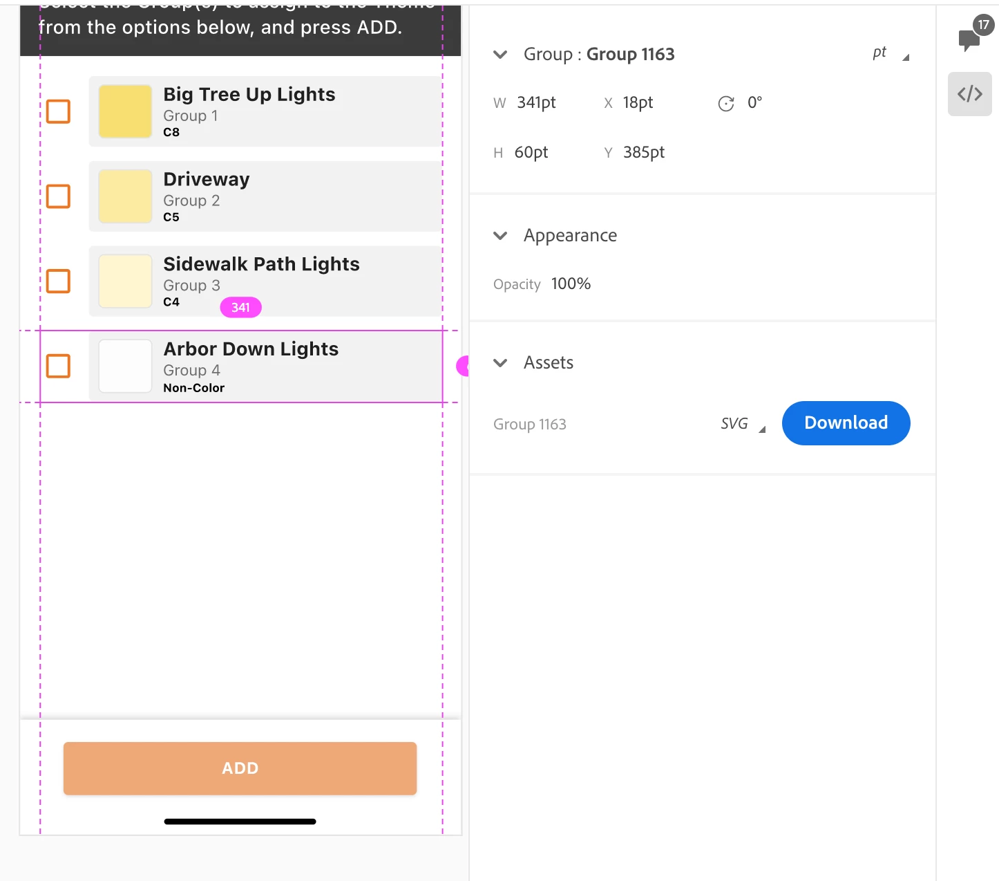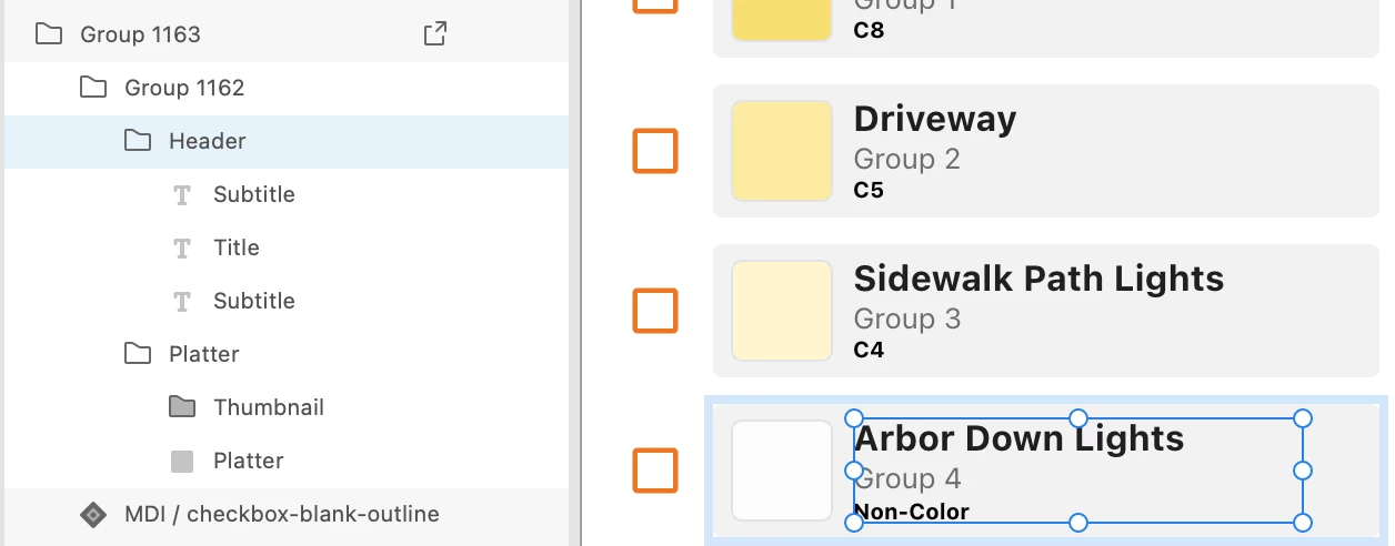The image below shows an example of a card that was grouped while I was designing in XD. Even though the "mark for export" check box was checked, the information for items inside of the card (text size, color, etc, spacing, color chip size, padding, and so on) cannot be retrieved on the XD Share site.