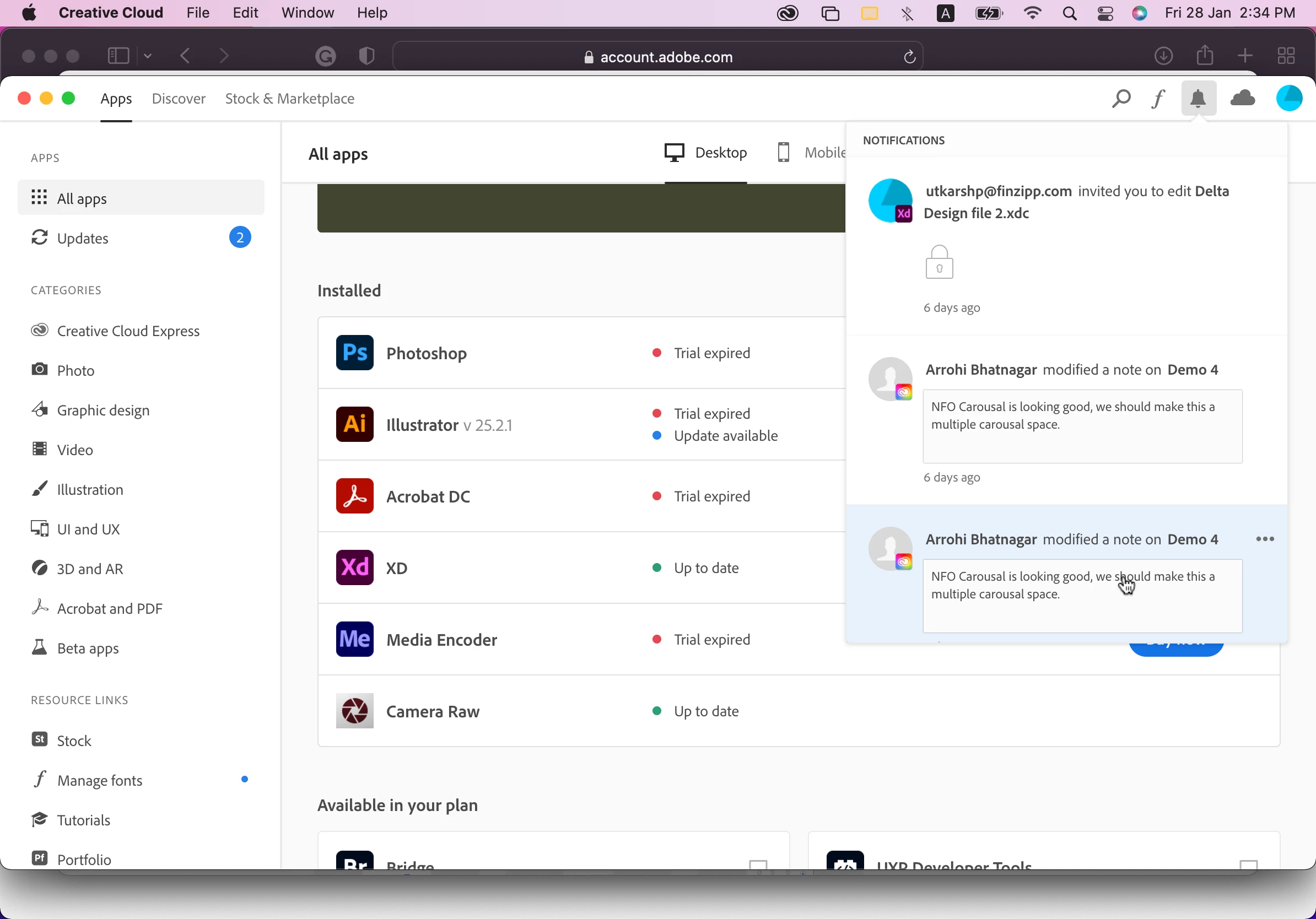 I'm using my companies my Adobe account, on 27th January they had updated the license. We have three profiles under that account. 1st valuefy technology Pvt. Ltd, 2nd Valuefy Technology, 3rd Personal. Previously my work was saved in the second profile "Valuefy Technology" but after the IT team updated the license, I'm unable to access my xD files. whenever I open xD it says "starter plan". Now I'm unable to see & access my cloud documents which I have been working on for the past 2 months. But in the adobe account (refer to screenshot- 1) it already says we have subscribed to the whole adobe plan, but when I open the xD it says you have to upgrade from starter plan (refer to screenshot - 2). In the Creative Cloud desktop app, I can view my past notification and file sharing(refer to Screenshot - 3). But I'm unable to access xD.