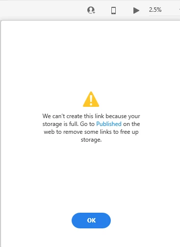 So I created a new one (which synced eventually), but then I couldn't send invitations to others through XD for some reason (screenshot #2). The error I got is "Storage full. Go on Published and delete links", but there's space in storage (2.4 GB of 1 TB used) and barely any links in Published (less then ten and I even deleted some just in case).
