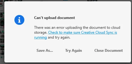 So I found a workaround and invited others through Creative Cloud, but now it won't sync the file again. The error says that it "cant upload a document". (screenshot #3)