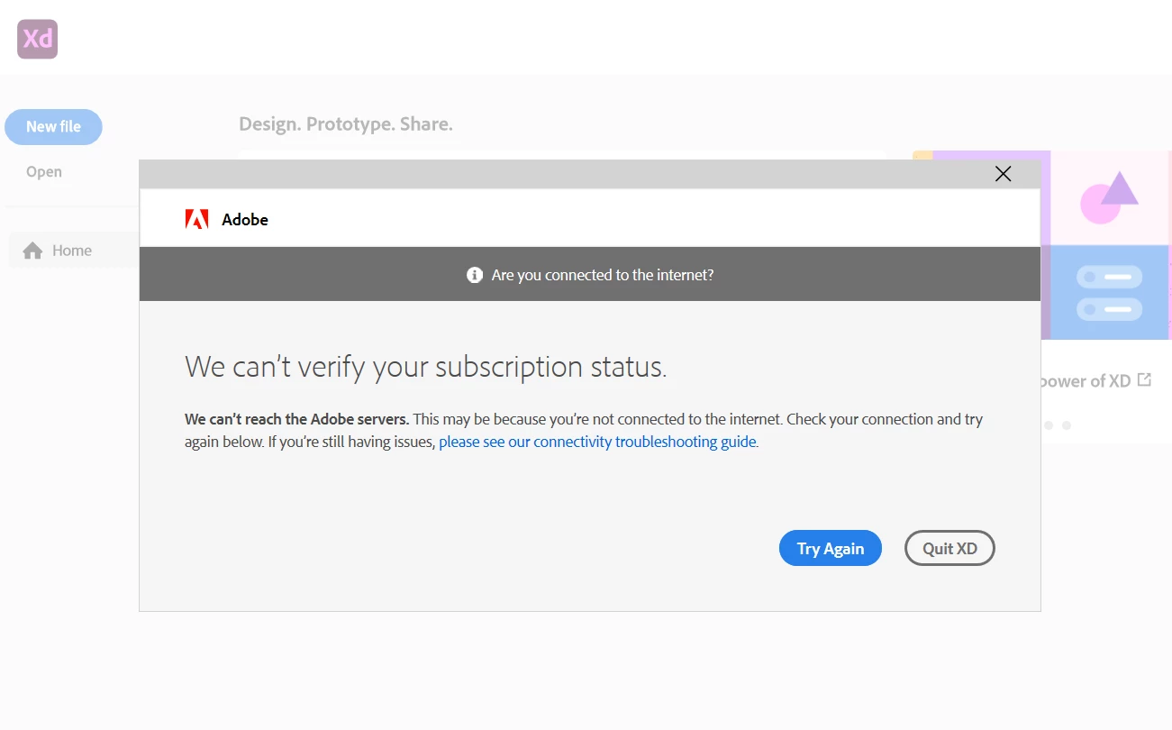 Hello I need urgent help as I have assignments due in a week!! I am not sure how this happened and how to fix it. Whenever I open Adobe XD it says "we cant verify subscription status. I tried logging in my adobe creative cloud however it would not load and kept on saying error. I'm also logged out of all other apps such as illustrator and indesign. how do i fix this???