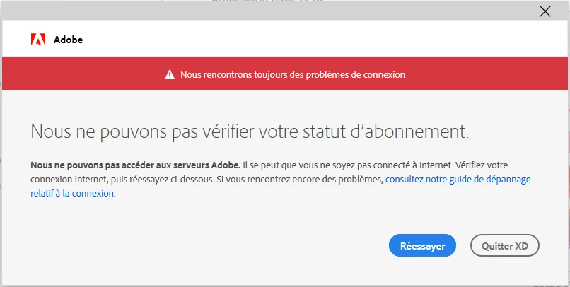 I am posting this message because for a week now I can no longer use XD on my main PC. When I launch XD it says "We can't verify your subscription status." I specify that I am subscribed and that my account works correctly on other PCs. I tried everything but I found no answer to this problem: Disabled my Antivirus (Eset NOD 32), Reinstalled XD and Creative Cloud, checked access to Adobe servers, TLS... Nothing to do I still have this damn message.