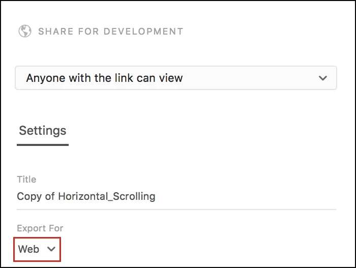- Select Share > Share for Development, and ensure that you choose the option "Web" in the Export for menu.