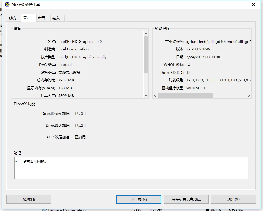 intel HD Graphics 520, driver version is 22.20.16.4749, the third pic shows it support Direct3D DDI:12