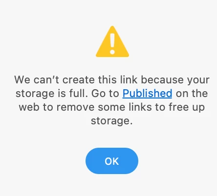 XD cannot create share link because storage is full. Go to published link to clear space.