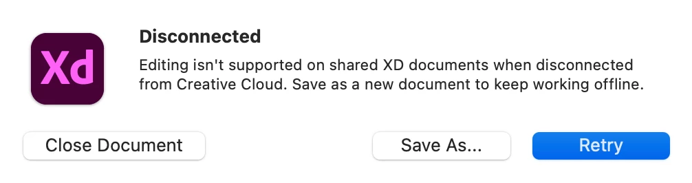 "Disconnected Editing isn't supported on shared XD documents when disconnected from Creative Cloud. Save as a new document to keep working offline."
