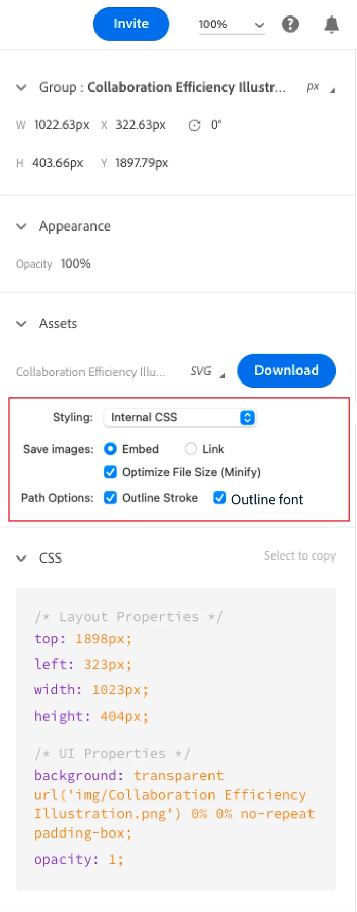 Xd Export SVG outline fonts option and dev specs svg options on download or upon dev specs creation