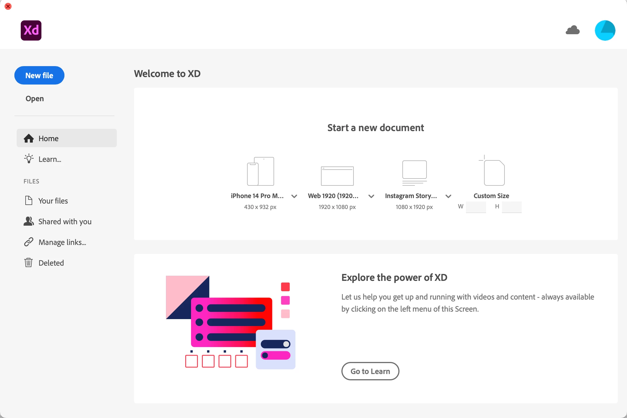 I can download the app and open it to the 'Welcome to XD' window. I can select all the options (if I select learn it takes me to a webpage etc). But when I open a new file the artboard appears, but then it's like nothing else works. I can't select any tools or menu items (can't import, save, quit etc).