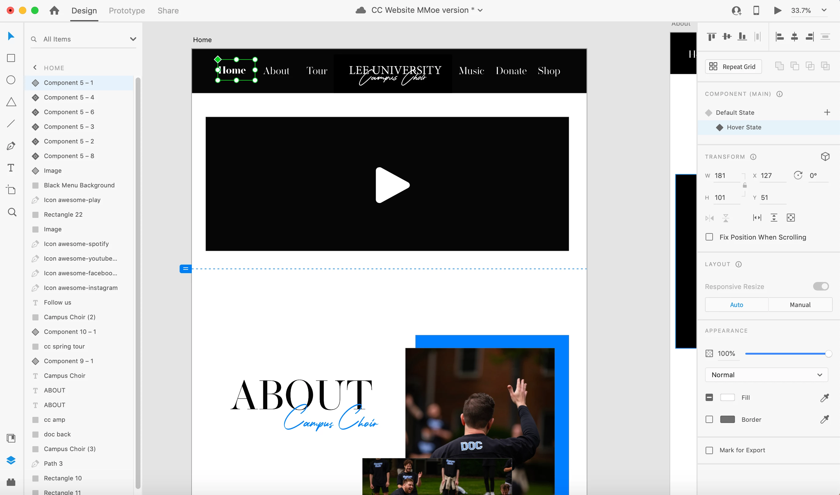 3. Menu item components: Instead of a pseudo rectangle behind the element to mark the clickable area, use padding on the component. I also prefer to center the text and use auto-width for the text elements, which avoids some weird displacement happening between states and different text.
