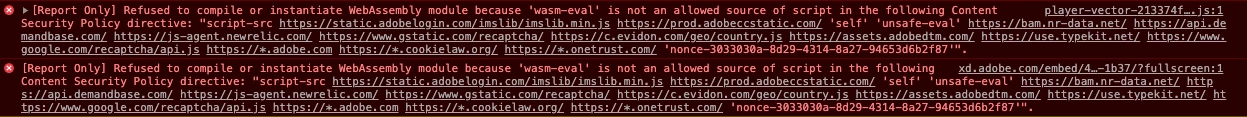 [Report Only] Refused to compile or instantiate WebAssembly module because 'wasm-eval' is not an allowed source of script in the following Content Security Policy directive: "script-src https://static.adobelogin.com/imslib/imslib.min.js https://prod.adobeccstatic.com/ 'self' 'unsafe-eval' https://bam.nr-data.net/ https://api.demandbase.com/ https://js-agent.newrelic.com/ https://www.gstatic.com/recaptcha/ https://c.evidon.com/geo/country.js https://assets.adobedtm.com/ https://use.typekit.net/ https://www.google.com/recaptcha/api.js https://*.adobe.com https://*.cookielaw.org/ https://*.onetrust.com/ 'nonce-3033030a-8d29-4314-8a27-94653d6b2f87'".