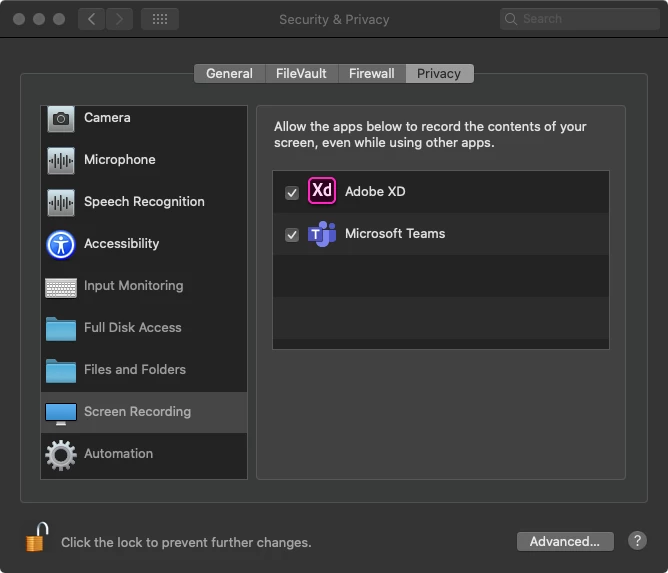 Hello,  I followed your instruction, however, I couldn't find Adobe XD in my screen recording (see my screenshot below).