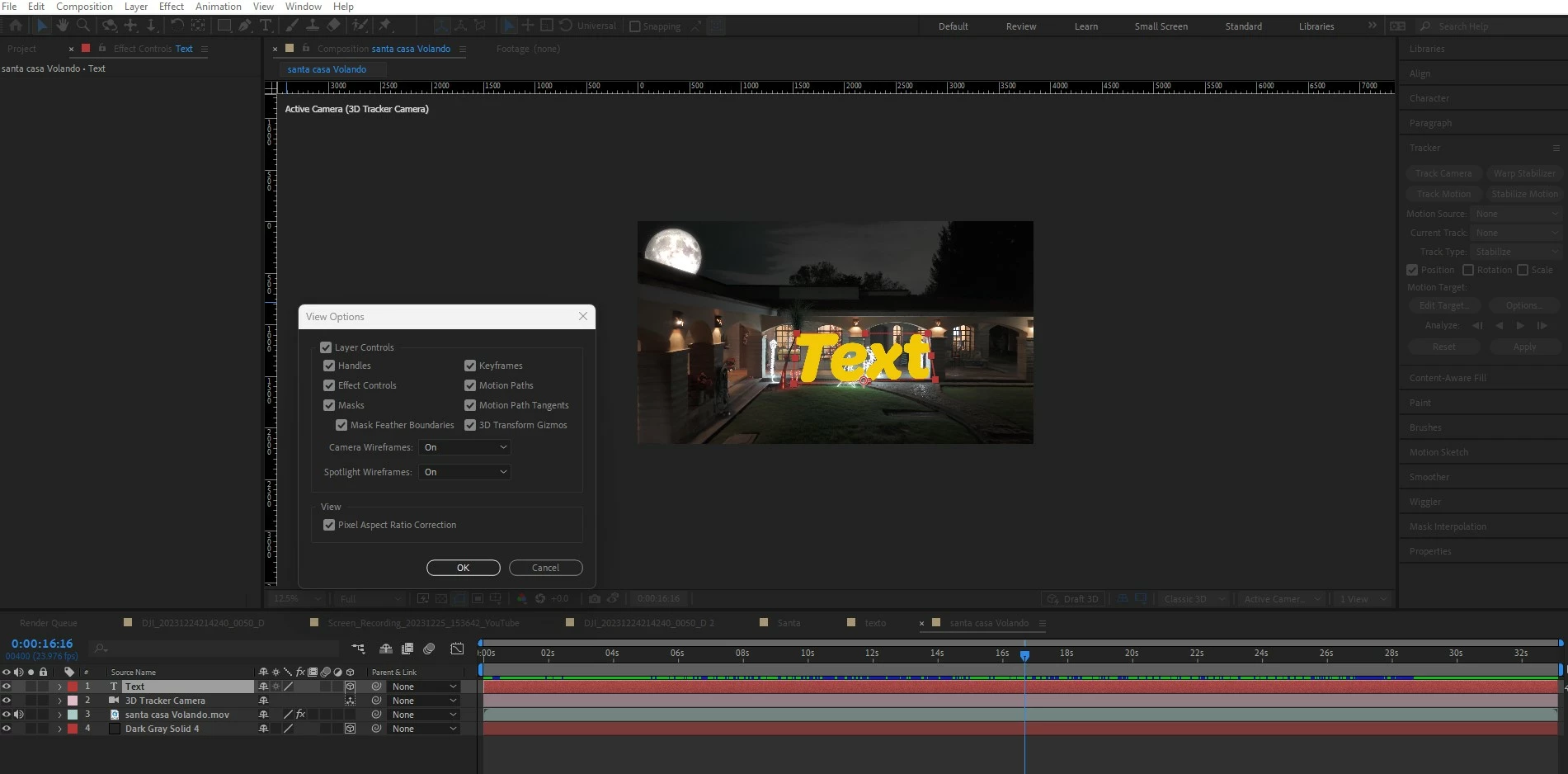 On the 3D Camera tracker Fx, after a successful camera track, creating a new Text, Camera, null ,etc.  The created object does not show a 3D axis on it,  it may only be seen if you set camera to default, but is not usable, also it seems only to be shown in multiple views but only at default camera.